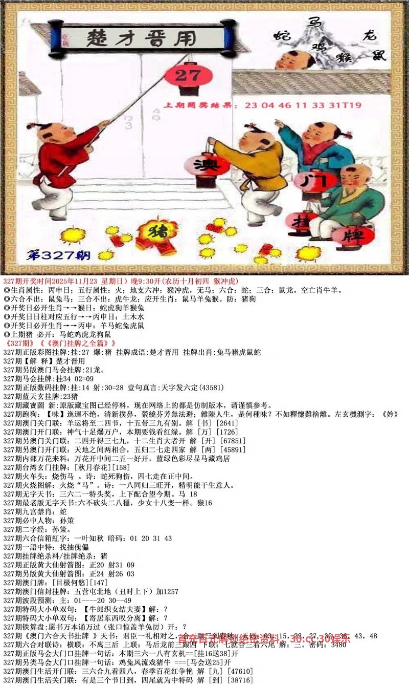 327期阳阴两肖阴肖+猴虎】开:蛇37中